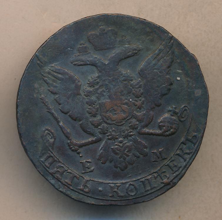 Лицевая сторона — двуглавый орел (выделяют 17 типов орла) и обозначение номинала (пять копеекъ), оборотная — вензель Екатерины II и дата. Нормативный вес — 51,19 грамма, гурт — сетка или шнур.