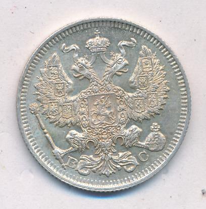 Лицевая сторона — гербовый орел, оборотная —обозначение номинала (20 копеекъ), окруженное венком из лавровой и дубовой ветвей и дата.