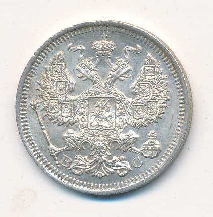 Лицевая сторона — гербовый орел, оборотная —обозначение номинала (20 копеекъ), окруженное венком из лавровой и дубовой ветвей и дата.