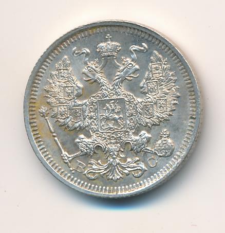 Лицевая сторона — гербовый орел, оборотная —обозначение номинала (20 копеекъ), окруженное венком из лавровой и дубовой ветвей и дата.