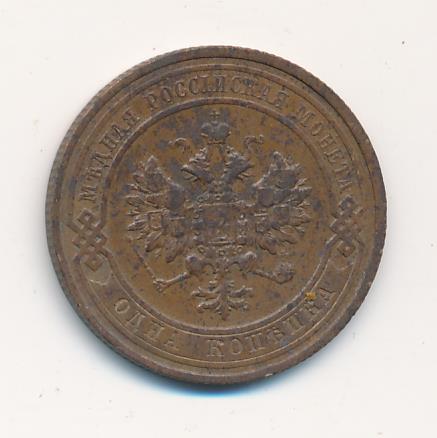 Лицевая сторона — двуглавый орел, надпись МЕДНАЯ РОССIЙСКАЯ МОНЕТА и обозначение номинала (одна копейка); оборотная — обозначение номинала (1 копейка) в бусовом ободке и дата. Нормативный вес — 3,28 грамма, гурт рубчатый.