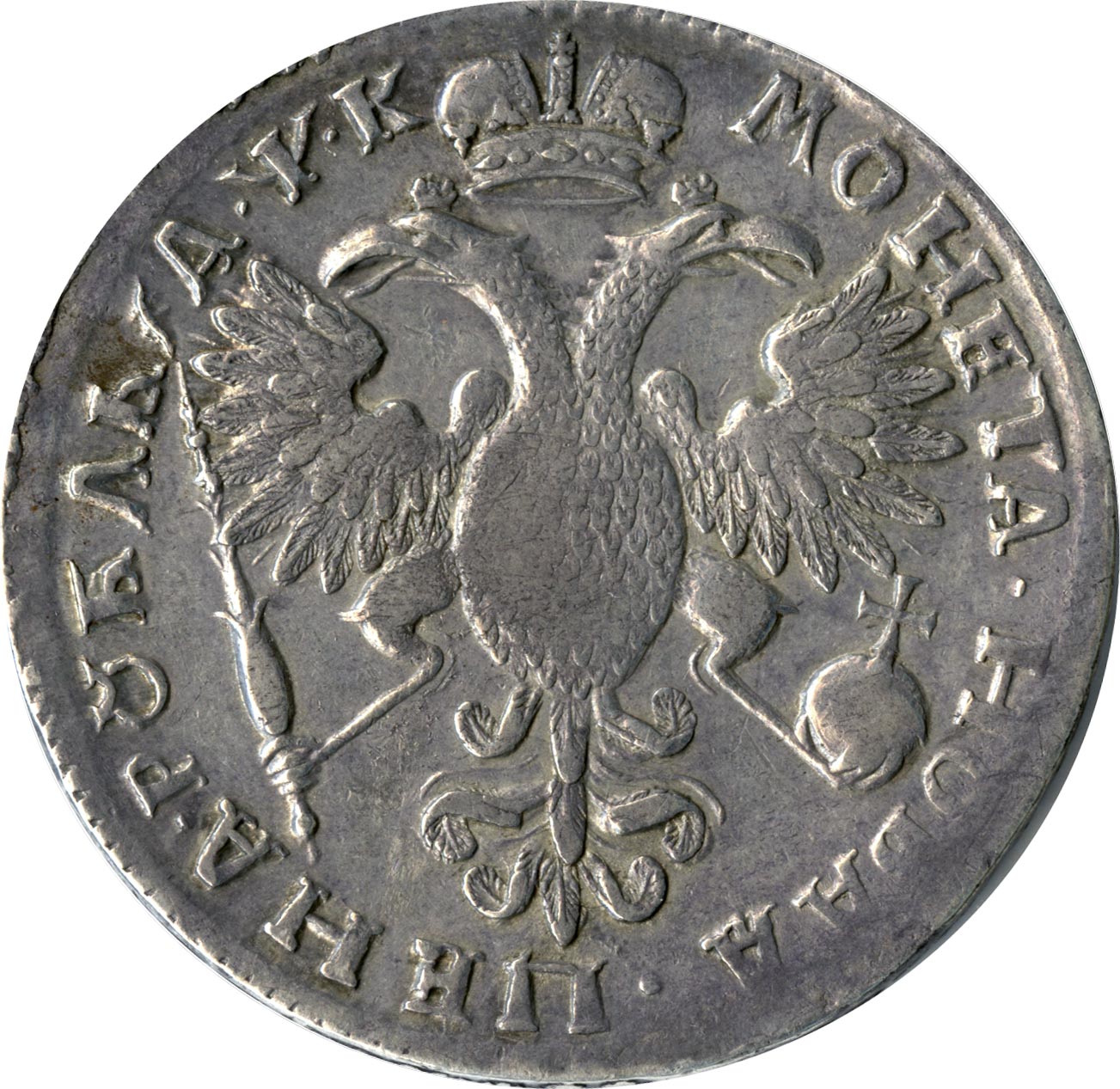 Легенда лицевой стороны - «Царь Петр Алексеевич Всея России Самодержец», оборотной - «Монета новая цена рубль» и дата кириллицей. Проба монет — 729, нормативный вес — 28, 44 грамма.