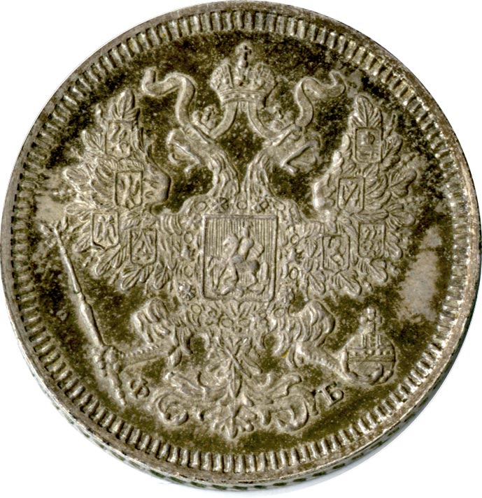 Лицевая сторона — гербовый орел, оборотная —обозначение номинала (20 копеекъ), окруженное венком из лавровой и дубовой ветвей и дата.
