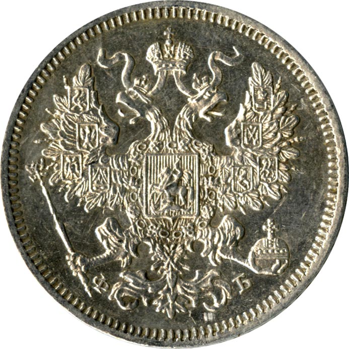 Лицевая сторона — гербовый орел, оборотная —обозначение номинала (20 копеекъ), окруженное венком из лавровой и дубовой ветвей и дата.