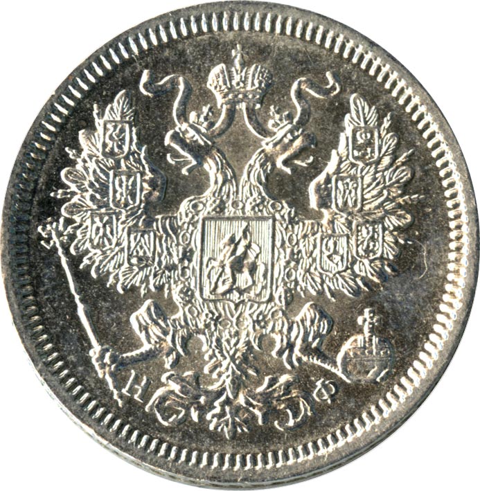 Лицевая сторона — гербовый орел, оборотная —обозначение номинала (20 копеекъ), окруженное венком из лавровой и дубовой ветвей и дата.