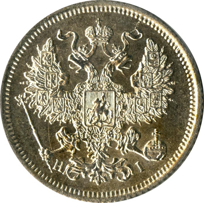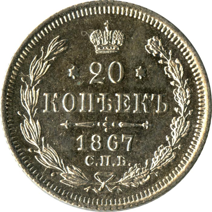 Лицевая сторона — гербовый орел, оборотная —обозначение номинала (20 копеекъ), окруженное венком из лавровой и дубовой ветвей и дата.
