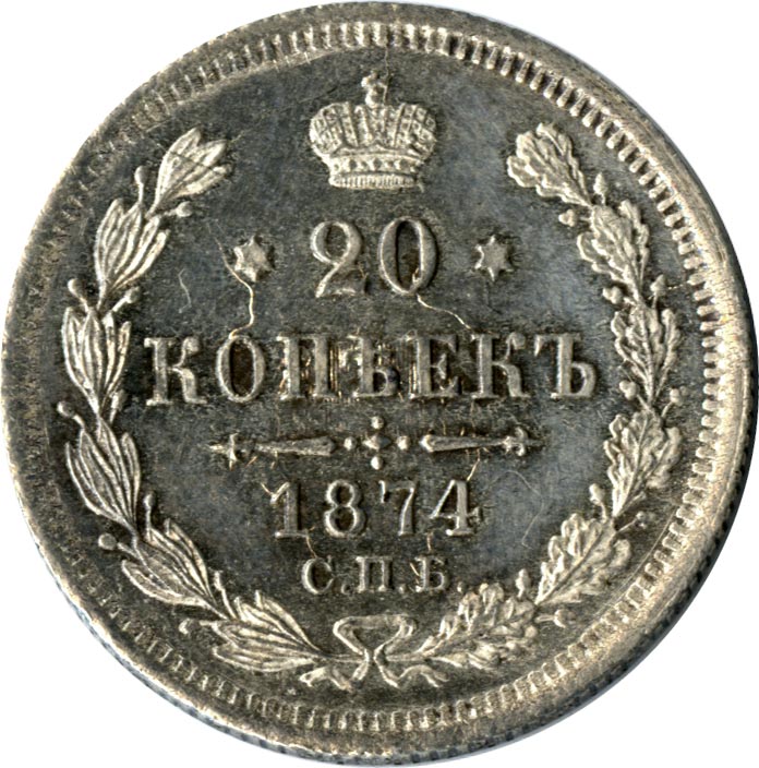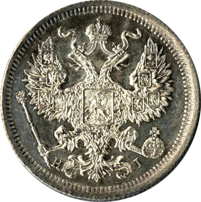 Лицевая сторона — гербовый орел, оборотная —обозначение номинала (20 копеекъ), окруженное венком из лавровой и дубовой ветвей и дата.