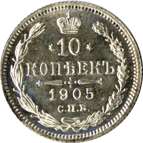 Лицевая сторона — гербовый орел, оборотная —обозначение номинала (10 копеекъ), окруженное венком из лавровой и дубовой ветвей и дата.