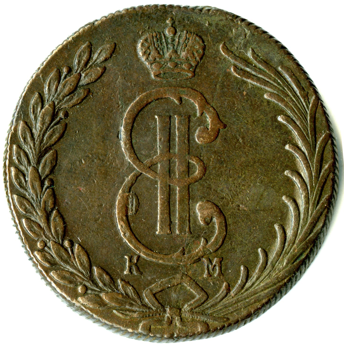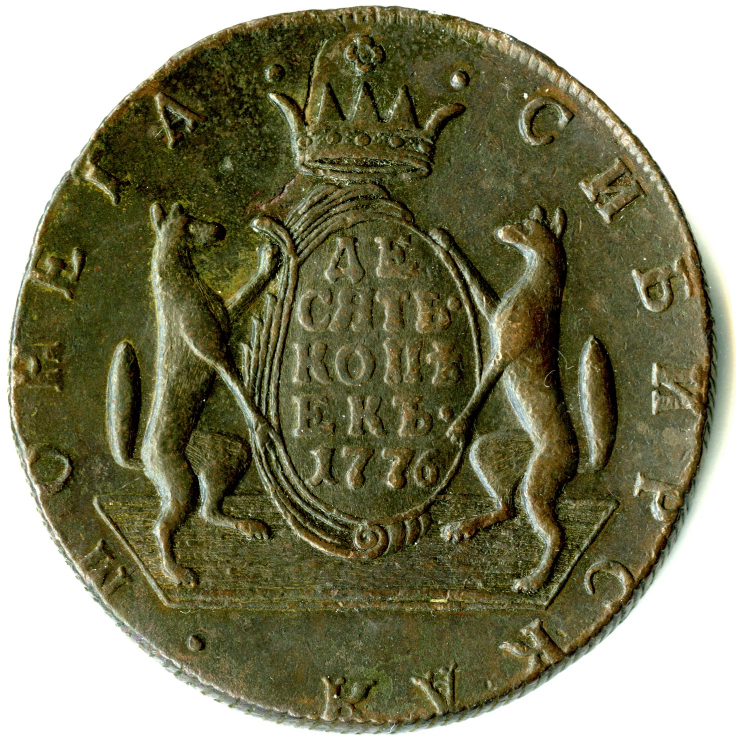 Лицевая сторона - два соболя поддерживают щит с обозначением номинала (десять копеекъ) под короной, надпись «СИБИРСКАЯ МОНЕТА». Оборотная — вензель Екатерины II в венке из пальмовой и лавровой ветвей. Вес — 65, 52 грамма. Нормативный вес — 65,52 грамма, это самая увесистая медная монета регулярного чекана в истории российской нумизматики. Гурт — надпись «колыванская медь» или шнур.