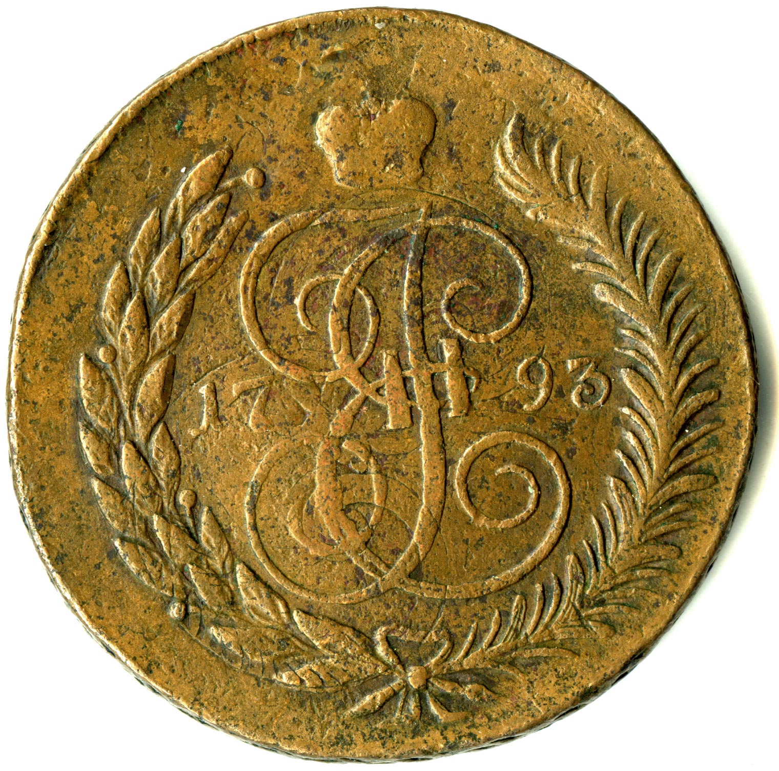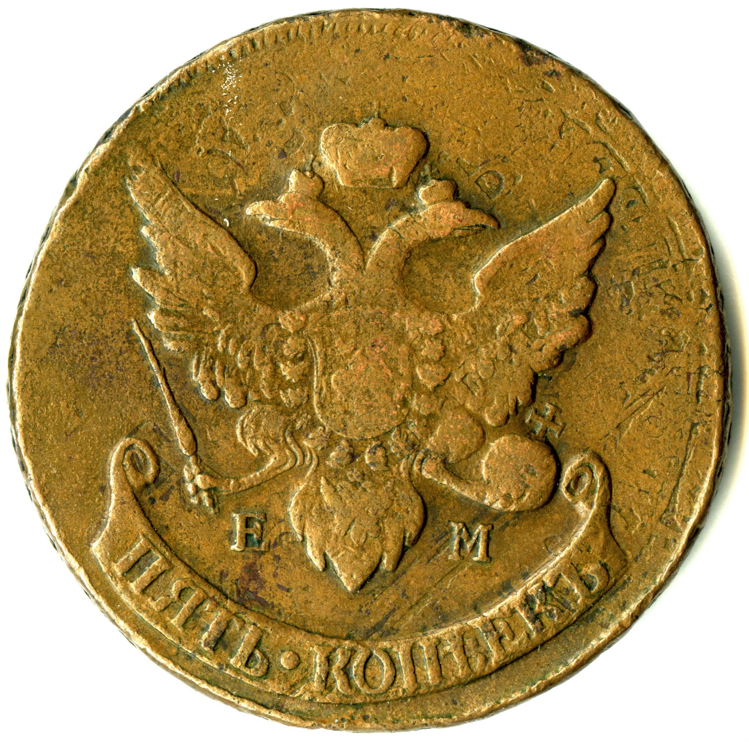 Лицевая сторона — двуглавый орел (выделяют 17 типов орла) и обозначение номинала (пять копеекъ), оборотная — вензель Екатерины II и дата. Нормативный вес — 51,19 грамма, гурт — сетка или шнур.