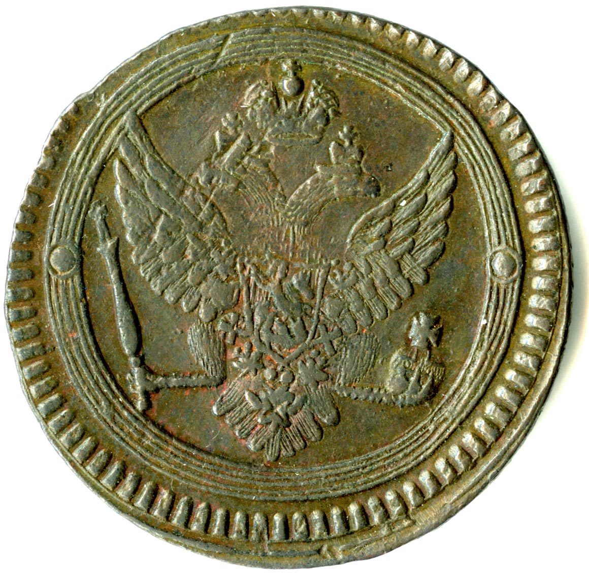 В первое десятилетие правления Александра I медным монетам возвращается принятый при Екатерине II ряд номиналов. Все они оформлены единообразно: на лицевой стороне — двуглавый орел, на оборотной — номинал и дата. Обе стороны обрамлены концентрическими линейными кружками, номинал дополнительно продублирован крупными счетными точками.