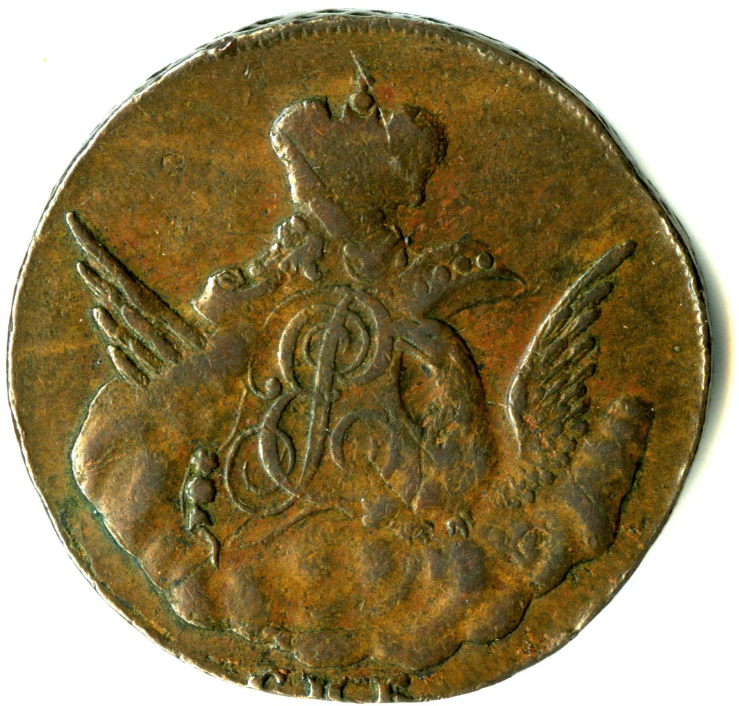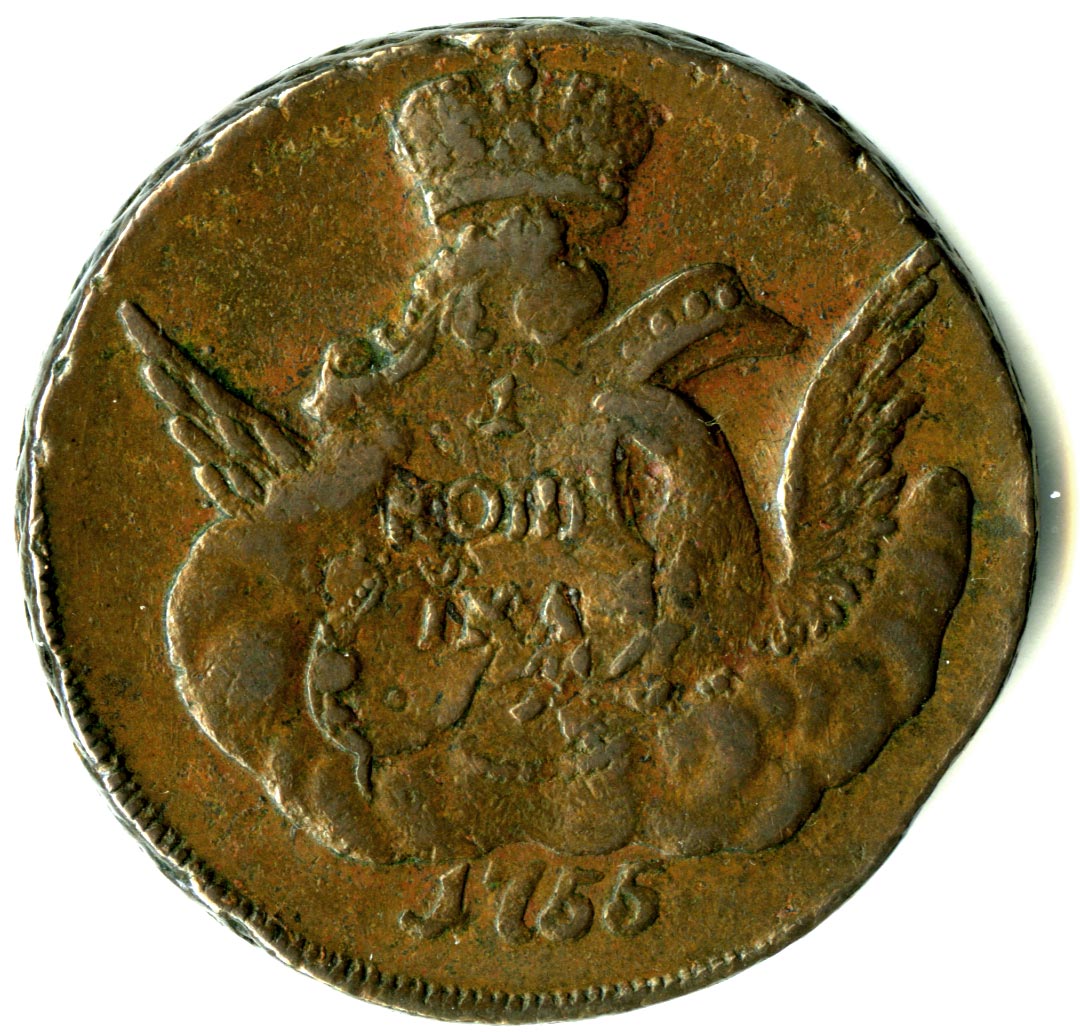 18 августа 1755 года Елизавета подписывает указ о перечеканке бывших пятаков в копейку 8-рублевой монетной стопы — самой низкой за всю историю российской медной монеты.