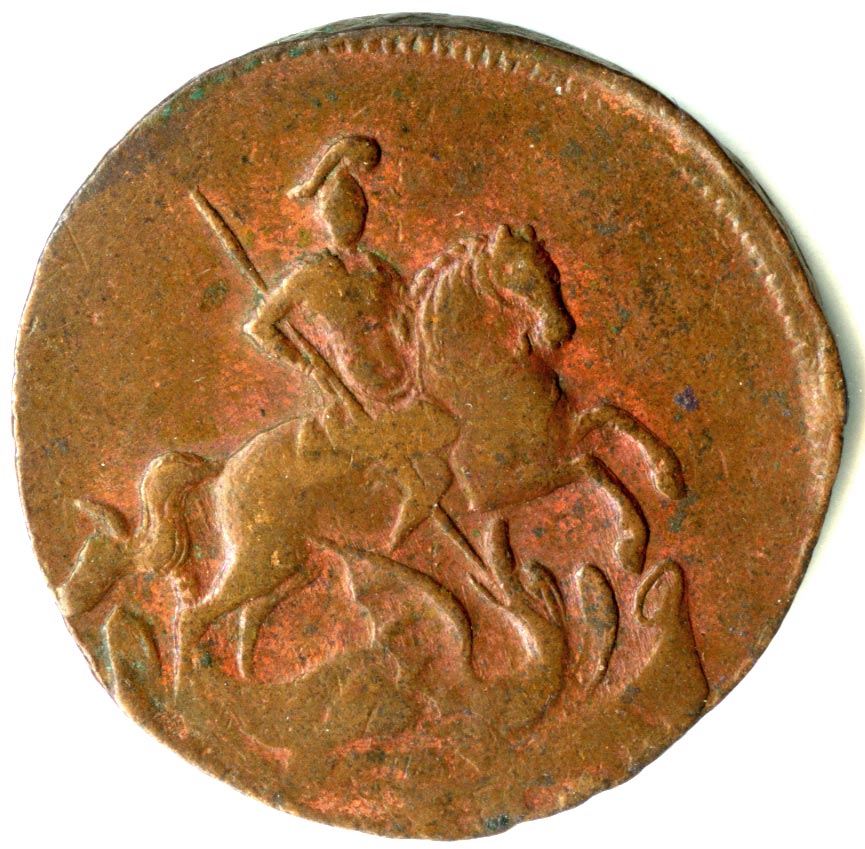 Производство ведется на московском Красном, Екатеринбургском и Сестрорецком дворах. Лицевая сторона — Георгий Победоносец и обозначение номинала (копейка) в картуше, оборотная — сложный симметричный вензель Елизаветы Петровны и дата. Нормативный вес — 10,24 грамма, гурт — сетка.