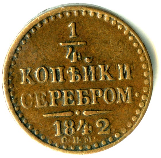 На новых монетах равенство серебряному курсу указано прямо в номинале: «1/4 КОПЕЙКИ СЕРЕБРОМ». Указ об их выпуске следует 6 сентября 1840 года («О новой медной монете на серебро 16-рублевого в пуде достоинства»). Массовая чеканка началось за год до этого на Екатеринбургском (знак ЕМ) и Сузунском (знак СМ) дворах. В качестве временной меры в 1840-1843 годах к ним подключается Ижорский завод (знак СПМ). С 1844 года после «значительного скопления медной монеты в народном обращении» в Екатеринбурге производство прекращается, а в Сузуне сокращается.