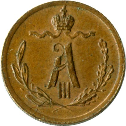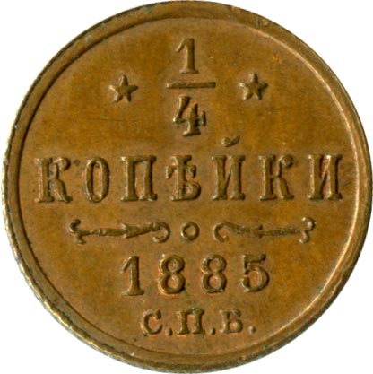 Лицевая сторона — вензель Александра II в венке из лавровой и дубовой ветвей; оборотная — обозначение номинала (1/4 копейки) и дата. Нормативный вес — 0,82 грамма, гурт рубчатый.