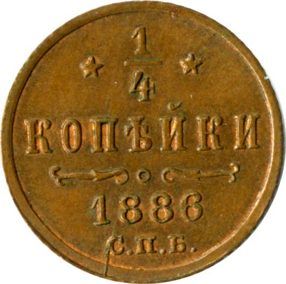 Лицевая сторона — вензель Александра II в венке из лавровой и дубовой ветвей; оборотная — обозначение номинала (1/4 копейки) и дата. Нормативный вес — 0,82 грамма, гурт рубчатый.