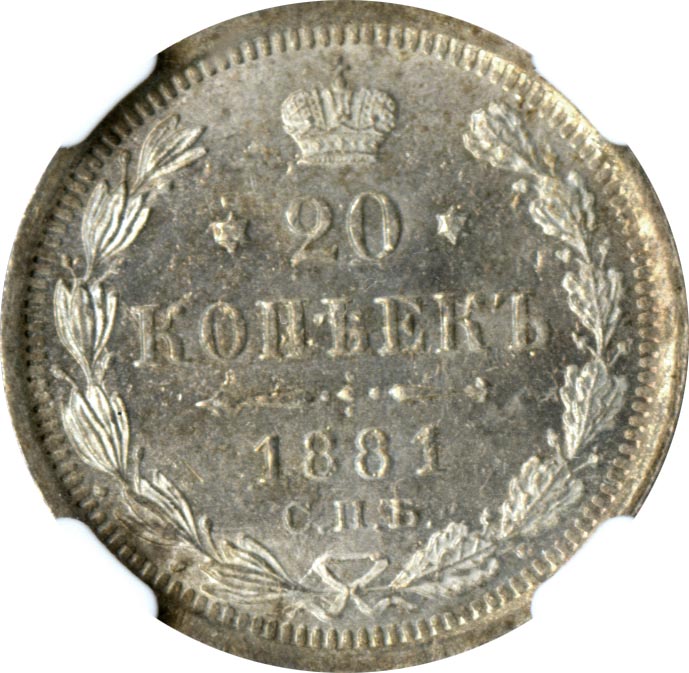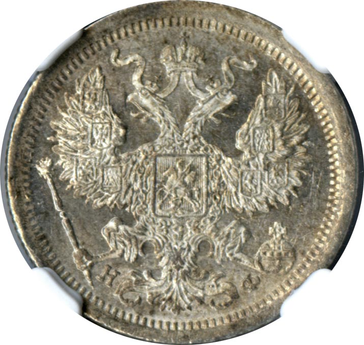 Лицевая сторона — гербовый орел, оборотная —обозначение номинала (20 копеекъ), окруженное венком из лавровой и дубовой ветвей и дата.