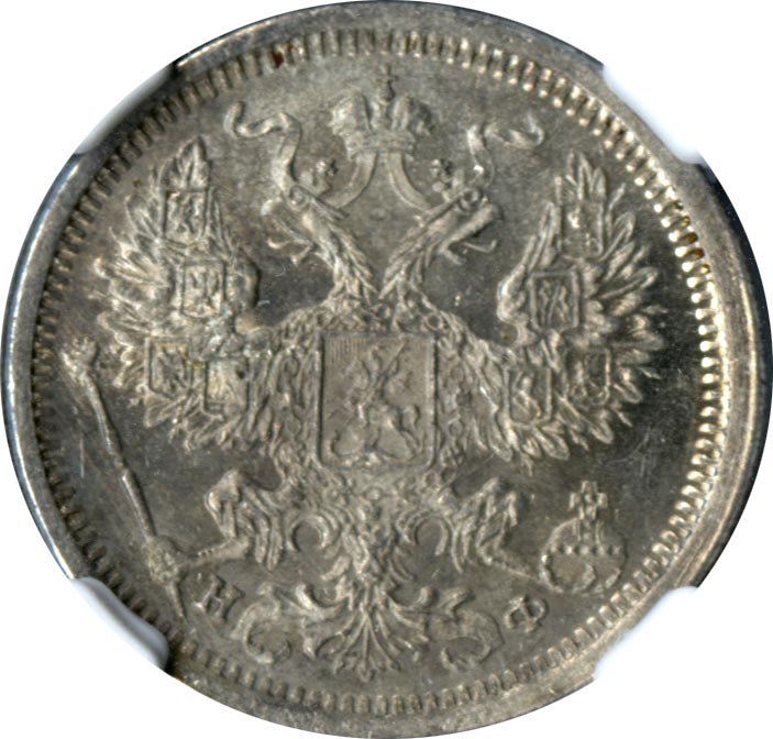 Лицевая сторона — гербовый орел, оборотная —обозначение номинала (20 копеекъ), окруженное венком из лавровой и дубовой ветвей и дата.
