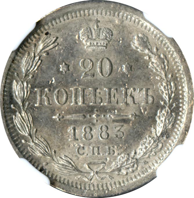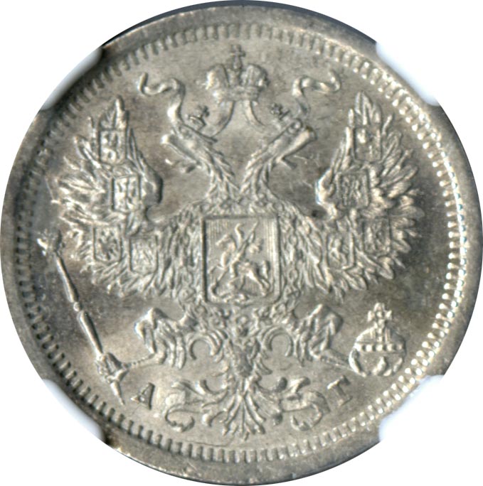 Лицевая сторона — гербовый орел, оборотная —обозначение номинала (20 копеекъ), окруженное венком из лавровой и дубовой ветвей и дата.