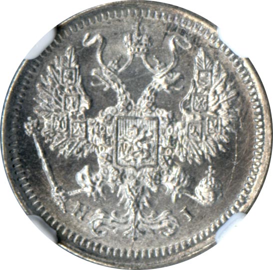 Лицевая сторона — гербовый орел, оборотная —обозначение номинала (10 копеекъ), окруженное венком из лавровой и дубовой ветвей и дата.