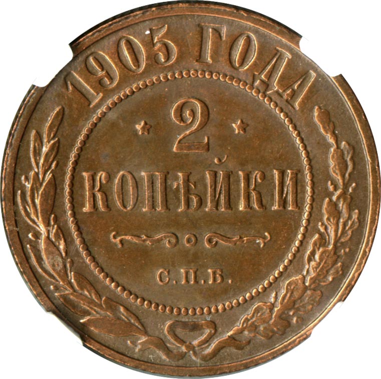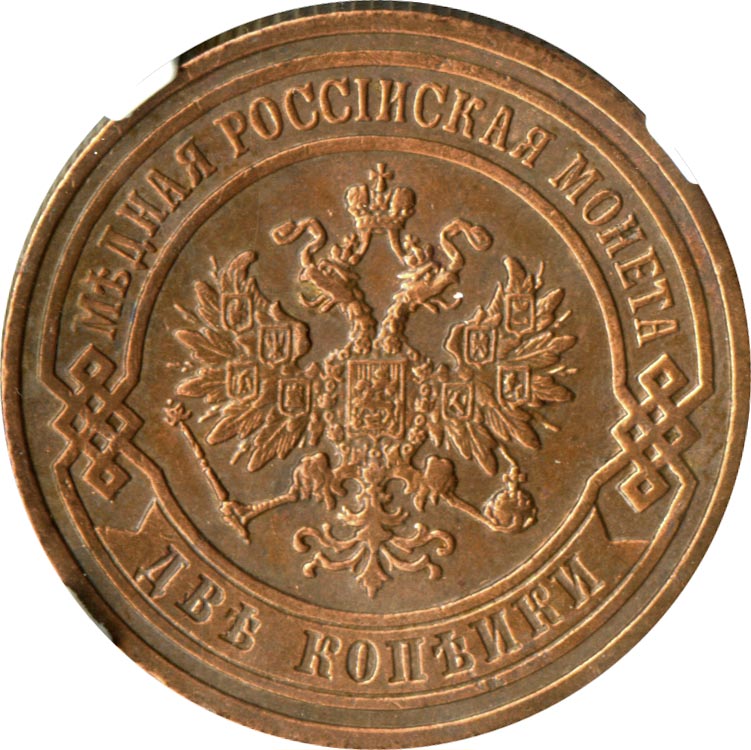 Лицевая сторона — двуглавый орел, надпись МЕДНАЯ РОССIЙСКАЯ МОНЕТА и обозначение номинала (две копейки); оборотная — обозначение номинала (2 копейки) в бусовом ободке и дата. Нормативный вес — 6,55 грамма, гурт рубчатый.