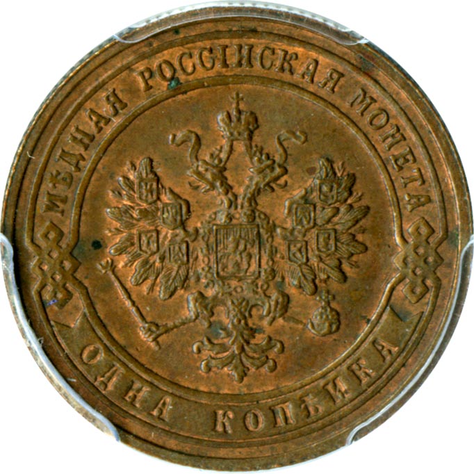 Лицевая сторона — двуглавый орел, надпись МЕДНАЯ РОССIЙСКАЯ МОНЕТА и обозначение номинала (одна копейка); оборотная — обозначение номинала (1 копейка) в бусовом ободке и дата. Нормативный вес — 3,28 грамма, гурт рубчатый.