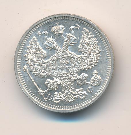 Лицевая сторона — гербовый орел, оборотная —обозначение номинала (20 копеекъ), окруженное венком из лавровой и дубовой ветвей и дата.