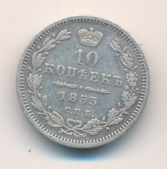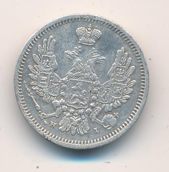 Лицевая сторона — новый гербовый орел с поднятыми крыльями, оборотная —обозначение номинала (10 копеекъ), окруженное венком из лавровой и дубовой ветвей и дата. Проба — 868, нормативный вес — 2,07 грамма.