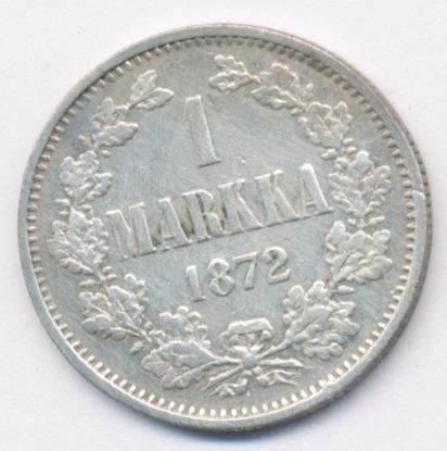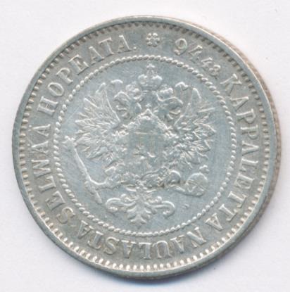 Лицевая сторона — российский двуглавый орел с гербом Великого княжества Финляндского на груди в кольцевой надписи с указанием количества штук (94,48) из фунта сплава серебра, оборотная — номинал и дата в венке из дубовых листьев. Проба — 868, нормативный вес — 5,18 грамма, гурт рубчатый.