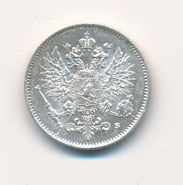 Лицевая сторона — российский двуглавый орел с гербом Великого княжества Финляндского на груди, оборотная — номинал и дата в венке из дубовых листьев. Проба — 750, нормативный вес — 1,27 грамма, гурт рубчатый.