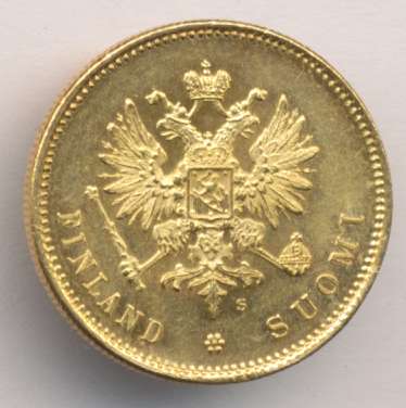 Лицевая сторона — российский двуглавый орел с гербом Великого княжества Финляндского на груди, оборотная — номинал и дата в кольцевой надписи с указанием содержания чистого золота и меди в граммах. Проба — 900, нормативный вес — 6,45 грамма, гурт ребристый.