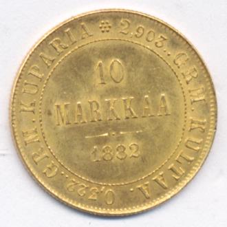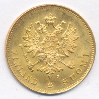 Лицевая сторона — российский двуглавый орел с гербом Великого княжества Финляндского на груди, оборотная — номинал и дата в кольцевой надписи с указанием содержания чистого золота и меди в граммах. Проба — 900, нормативный вес — 3,23 грамма, гурт ребристый.