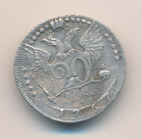 Выделяют два типа - «с шарфом на шее» и без него. Монеты 1764 года ММД со знаком гравера выполнены штемпелями полуполтин. На оборотной стороне монеты — двадцать счетных точек. Лицевая сторона — портрет императрицы и надпись «Б М ЕКАТЕРИНА II IМП I САМОД ВСЕРОС», оборотная — двуглавый орел, обозначение номинала цифрой и счетными точками и дата. Проба — 750, нормативный вес — 4,77 грамма, гурт — шнур.