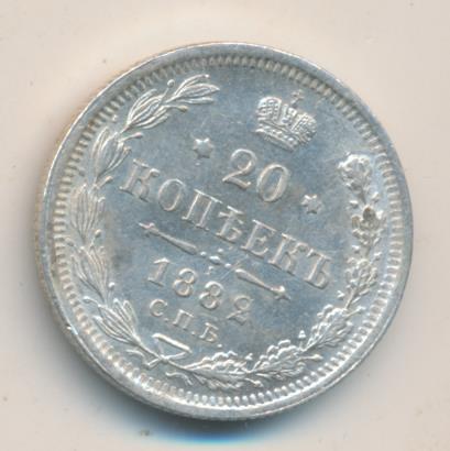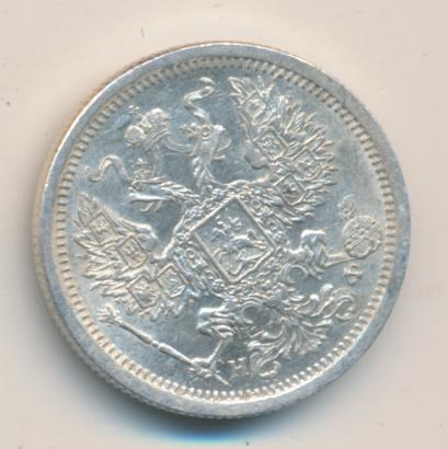 Лицевая сторона — гербовый орел, оборотная —обозначение номинала (20 копеекъ), окруженное венком из лавровой и дубовой ветвей и дата.