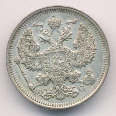 Лицевая сторона — гербовый орел, оборотная —обозначение номинала (20 копеекъ), окруженное венком из лавровой и дубовой ветвей и дата.