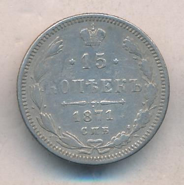 Лицевая сторона — гербовый орел, оборотная —обозначение номинала (15 копеекъ), окруженное венком из лавровой и дубовой ветвей и дата.