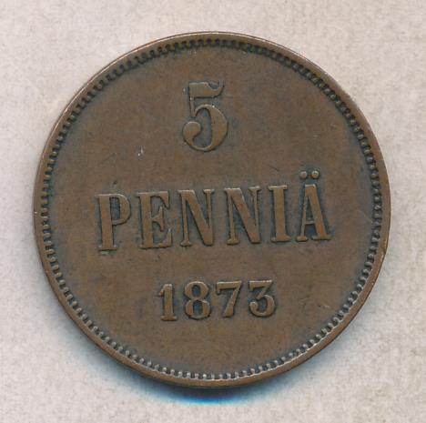 Лицевая сторона — вензель Александра II, оборотная — номинал (5 PENNIA) и дата. Нормативный вес — 6,40 грамма, гурт гладкий.