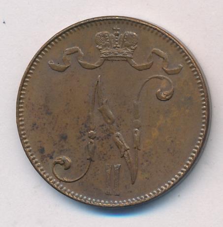Лицевая сторона — вензель Александра II, оборотная — номинал (5 PENNIA) и дата. Нормативный вес — 6,40 грамма, гурт гладкий.