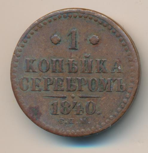 На новых монетах равенство серебряному курсу указано прямо в номинале: «1 КОПЕЙКА СЕРЕБРОМ». Указ об их выпуске следует 6 сентября 1840 года («О новой медной монете на серебро 16-рублевого в пуде достоинства»). Массовая чеканка началось за год до этого на Екатеринбургском (знак ЕМ) и Сузунском (знак СМ) дворах. В качестве временной меры в 1840-1843 годах к ним подключается Ижорский завод (знак СПМ). С 1844 года после «значительного скопления медной монеты в народном обращении» в Екатеринбурге производство прекращается, а в Сузуне сокращается.