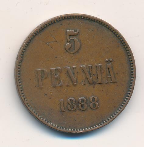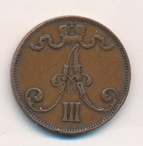 Лицевая сторона — вензель Александра II, оборотная — номинал (5 PENNIA) и дата. Нормативный вес — 6,40 грамма, гурт гладкий.