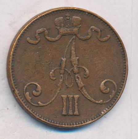 Лицевая сторона — вензель Александра II, оборотная — номинал (5 PENNIA) и дата. Нормативный вес — 6,40 грамма, гурт гладкий.