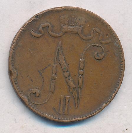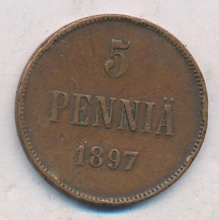 Лицевая сторона — вензель Александра II, оборотная — номинал (5 PENNIA) и дата. Нормативный вес — 6,40 грамма, гурт гладкий.
