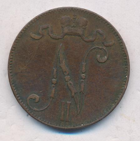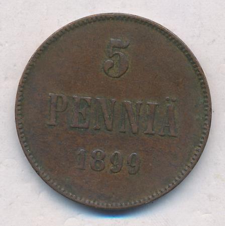 Лицевая сторона — вензель Александра II, оборотная — номинал (5 PENNIA) и дата. Нормативный вес — 6,40 грамма, гурт гладкий.