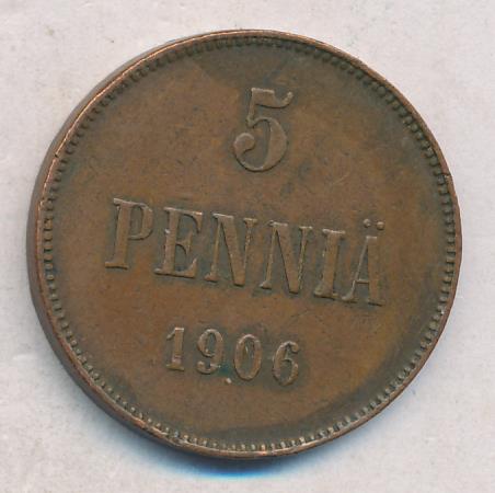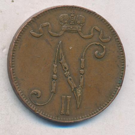 Лицевая сторона — вензель Александра II, оборотная — номинал (5 PENNIA) и дата. Нормативный вес — 6,40 грамма, гурт гладкий.