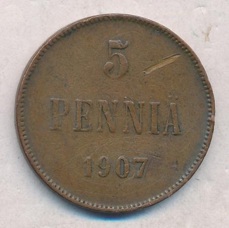 Лицевая сторона — вензель Александра II, оборотная — номинал (5 PENNIA) и дата. Нормативный вес — 6,40 грамма, гурт гладкий.