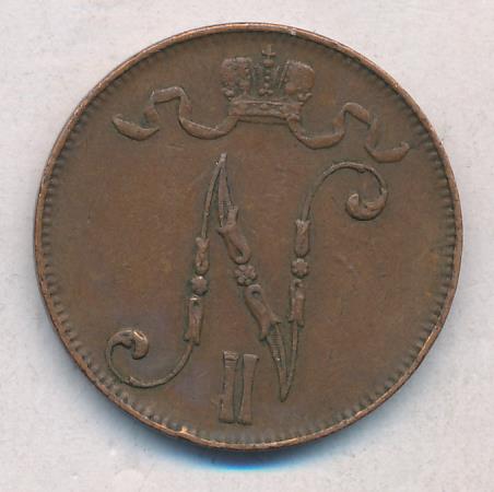 Лицевая сторона — вензель Александра II, оборотная — номинал (5 PENNIA) и дата. Нормативный вес — 6,40 грамма, гурт гладкий.