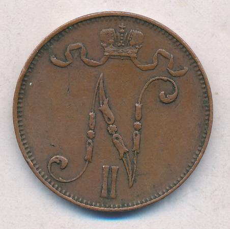 Лицевая сторона — вензель Александра II, оборотная — номинал (5 PENNIA) и дата. Нормативный вес — 6,40 грамма, гурт гладкий.