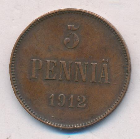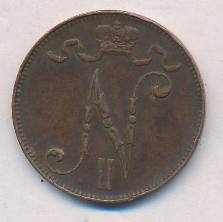 Лицевая сторона — вензель Александра II, оборотная — номинал (5 PENNIA) и дата. Нормативный вес — 6,40 грамма, гурт гладкий.
