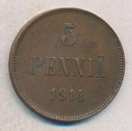 Лицевая сторона — вензель Александра II, оборотная — номинал (5 PENNIA) и дата. Нормативный вес — 6,40 грамма, гурт гладкий.