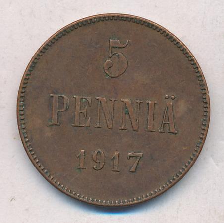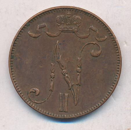 Лицевая сторона — вензель Александра II, оборотная — номинал (5 PENNIA) и дата. Нормативный вес — 6,40 грамма, гурт гладкий.